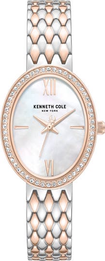 A crystal-embellished bezel lends understated glamour to an elegant quartz-powered timepiece with a two-tone design and mother-of-pearl dial.