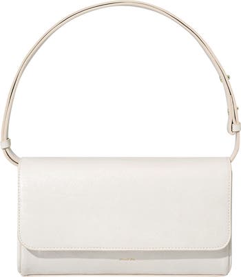 A structured silhouette and glossy, finely grained texture emphasize the vintage inspiration of this baguette-style shoulder bag centered with a glimmering foiled logo.