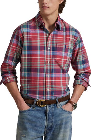 Timeless plaid patterns a button-down sport shirt tailored from cotton oxford cloth in a classic fit and finished with a pony-embroidered patch pocket.