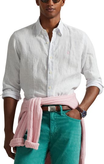 Iconic since its '71 debut, an embroidered polo rider hints at the preppy heritage of this breathable, lightweight linen button-down shirt refined with yarn-dyed stripes and lustrous shell buttons.