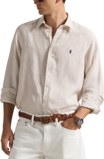 Iconic since its '71 debut, an embroidered polo rider hints at the preppy heritage of this breathable, lightweight linen button-down shirt refined with yarn-dyed stripes and lustrous shell buttons.