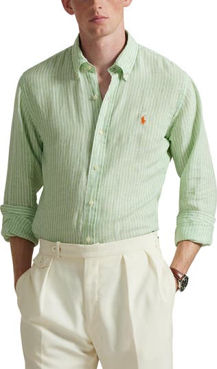 Iconic since its '71 debut, an embroidered polo rider hints at the preppy heritage of this breathable, lightweight linen button-down shirt refined with yarn-dyed stripes and lustrous shell buttons.