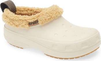 A slightly taller silhouette provides extra coverage from the elements in this familiar clog lined with plush fleece. Rubber pods on the sole enhance traction on slippery surfaces.