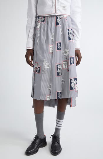Inspired by the label's heritage silk scarves, this crisply pleated skirt with an aysmmetric step hem features suiting-classic pinstripes and vintage-style floral graphics framed in signature varsity colors.