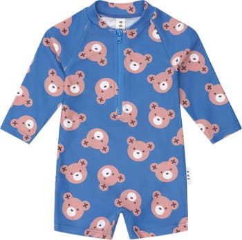 Getting ready for the beach is easy as in our zip up rashguard suit. This cute swimsuit shortie is rated UPF 50+, which is the highest achievable sun protective rating for fabrics. Consciously crafted with recycled polyester, it features a zip for speedy changes, long sleeves for added protection and cute Huxbear print, just for fun.