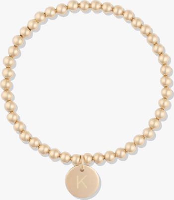 Chic + minimal meets personalized + made for everyday wear with this gorgeous bead bracelet with a custom initial. Handmade 14k Gold Filled stretchy bead bracelet with a 14k Gold Filled coin engraved with an initial.