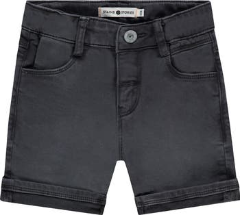 This deep charcoal-toned pair of denim shorts features a classic jean short silhouette with front and back pocket pairs and a button zip enclosure.