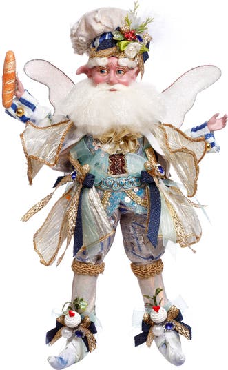 The Classic Kitchen Fairy (Small - 12 Inches) is a charming collectible figure that captures whimsical culinary magic in exquisite detail. Dressed in a shimmering ensemble of gold, blue, and ivory fabrics with sequins and ribbons, this fairy exudes festive elegance. With delicate wings, a chef’s hat adorned with flowers, and a tiny baguette in hand, it perfectly embodies the joyful spirit of a gourmet holiday kitchen.