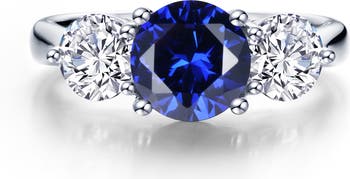 A brilliant lab-created sapphire is flanked by two sparkling simulated diamonds on this hand-polished band crafted from sterling silver bonded with platinum.