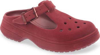 A mary jane silhouette refreshes a classic clog that's updated with a velvety finish and kept classic with porthole detailing.