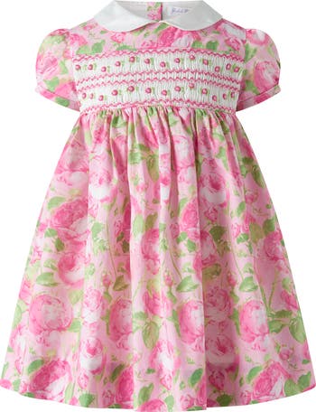 - Expertly crafted from premium lightweight cotton, the dress showcases intricate hand-smocking across the bodice, embroidered with petite coordinating floral details. A crisp white Peter Pan collar and gently puffed short sleeves add a polished, heritage finish, while the softly gathered skirt creates graceful movement—perfect for twirling through special celebrations. Coordinating bloomers complete the look, offering comfort and coverage for little ones on the move.
