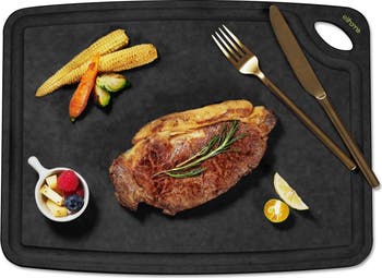 No matter veggies or meat, the reversible design allows you simply flip the board over and explore your endless options with both sides for different food types. - Knife friendly, resist deep cut marks and protects knives. Nonporous, do not absorb odor or harbor bacteria. - Featured deep groove design catch flour, liquids, sticky or acidic drippings from spilling over the counter. - Solid durable fiberwood material resists warping and not easy to crack, durable for daily use. Built-in thumb hole for easy grip & move around in busy kitchen and storage. - Heat resistant up to 350°F, and can be used as a trivet. Maintenance-free, easy-clean, and 100% dishwasher safe. - Made from high-density leaf pine material, made by high temperature and high pressure, safe and healthy for your everyday meal preparation, NSF certified. - Limited lifetime warranty.