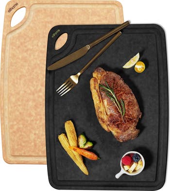 Made in the USA from high-density pine leaf sustainable material, this fiberwood 10"x 13"x 1/4” inch (24 x 33 x 0.63cm) cutting board is perfect for daily meal preparation; No matter veggies or meat, the reversible design allows you simply flip the board over and explore your endless options with both sides for different food types. | Knife friendly, resist deep cut marks and protects knives. Nonporous, do not absorb odor or harbor bacteria. | Featured deep groove design catch flour, liquids, sticky or acidic drippings from spilling over the counter. | Solid durable fiber wood material resists warping and not easy to crack, durable for daily use. Built|in thumb hole for easy grip & move around in busy kitchen and storage. | Heat resistant up to 350°F, and can be used as a trivet. Maintenance-free, easy-clean, and 100% dishwasher safe.