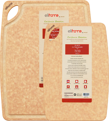 | This 2-piece sustainable and luxury cutting board set is all you need for your kitchen's daily use. Perfect for slicing, cutting, and serving, the options are endless. Made in the USA from high|density pine leaf sustainable material, made by high temperature and high pressure, safe and healthy for your everyday meal preparation. NSF certified. | Knife friendly, resist deep cut marks, and protects knives. Nonporous, do not absorb odor or harbor bacteria. | Featured deep groove design catch flour, liquids, sticky or acidic drippings from spilling over the counter. | Solid durable fiber wood material resists warping and not easy to crack, durable for daily use. | Built|in thumb hole for easy grip & move around in busy kitchen and storage. | Need to cut veggies or meats? Simply flip the board over and explore your endless options with both sides. Designed to use different food types.