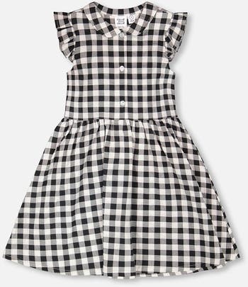 The sleeveless button down dress in gingham is a playful twist on a timeless classic. Featuring a peter pan collar, front button placket, and ruffled armholes, this dress combines charm with ease. Its gathered skirt makes it perfect for twirling, while the gingham pattern adds a fresh summer feel.