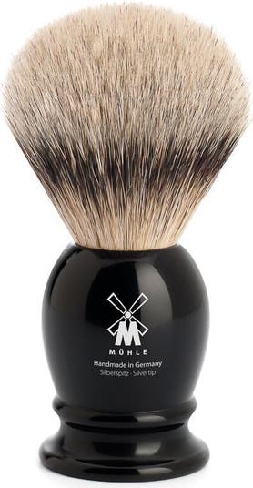 Made from high-grade resin, CLASSIC brushes deliver on both durability and beauty. Presented in classic black, the process of creating this shaving brush begins with each handle being turned out of solid resin rods. All individual pieces are then polished in several passes, giving the surface its characteristic gleam and securing its beauty for many years to come. Silvertip Badger: Natural, soft and flexible; only the best, carefully selected badger hair is used to create these handcrafted shaving brushes. Silvertip badger hair represents the finest, softest and rarest quality of badger hair available. The hair is renowned for its ability to retain large amounts of water, enabling the brush to quickly produce a dense, stable and creamy lather.Manufactured using historical tools, the semi-circular shape of the brush is created by hand when binding. The fine tips of the hair, therefore, do not require trimming and the natural softness of the hair is retained. This artisan procedure is mastered by only a few specialists worldwide, the quality of work evident in the even black band running through the predominantly silver brush head. Measurements Ring size S: 19 mm Dimensions: 34 mm x 93 mm Weight: 48 g