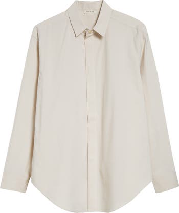 A smartly covered placket complements the minimal detailing of an oxford shirt tailored from a blend of cotton and virgin wool in a relaxed silhouette that still maintains the proportions of traditional shirting. Made with a touch of stretch, it brings both comfort and distinction to any elevated look.