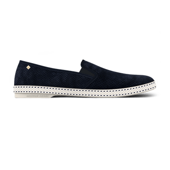 Perforated Suede Moccasin Perforated suede Canvas lining Gold-tone metal rivet Grosgrain ribbon trim Comfort elastics Removable leather insole Cotton band with saddle stitch around the sole PVC sole Please Note: Suede styles will stretch a little when worn. We recommend your usual size. These are natural leathers, and the quality and colors may vary between different productions. Made in Spain Composition: Upper: 100% cowhide suede Lining: 100% cotton canvas Insole: 30% lambskin leather, 40% carbon latex, 30% cork Outsole: 100% PVC Rivieras is committed to more responsible fashion. As part of our traceability project carried out in partnership with Crystal Chain, we share complete transparency on the origin and manufacturing of our products. To learn more, scan the QR code on the label inside the garment.