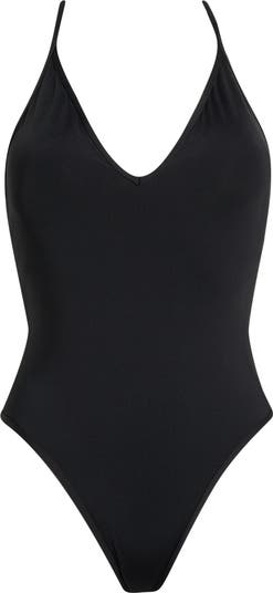 Seek out the best waves in this stretchy one-piece swimsuit made with a deeply dipped neck and high-cut legs.