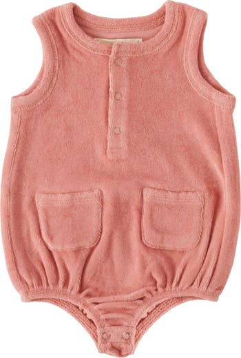 Supersoft organic-cotton terry keeps them feeling cozy in this bubble romper made with little patch pockets in front.