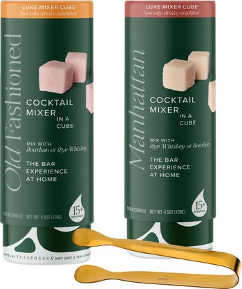 Create the perfect Old Fashioned or Manhattan with this set of delectable hand-crafted mixer cubes that will give your favorite bourbon or rye whiskey a perfectly balanced blend of flavors. The set includes a pair of golden tongs that make dropping a cube into your glass extra special.