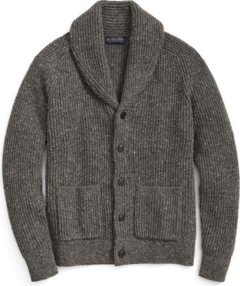A cozy shawl collar and chunky ribbed texture bring timeless appeal to this warm wool cardigan finished with roomy patch pockets.