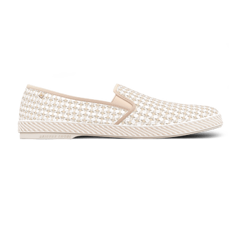 Moccasin in openwork woven fabric . Openwork woven fabric . Rivet in gilded metal . Cotton bias . Ease elastics . Removable leather insole . Cotton band around sole . PVC sole Made in Spain Composition . Upper: 65% polyurethane 30% polyetser 5% viscose fabric . Insole: 30% lambskin 40% carbon latex 30% cork . Outsole: 100% PVC Rivieras is committed to more responsible fashion. As part of our traceability project carried out in partnership with Crystal chain, we reveal the origin and manufacturing details of our garments. To find out more, scan the QR code on the label inside the garment.