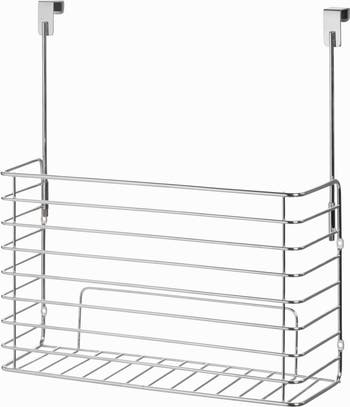 - OVER THE CABINET STORAGE: Wire over the cabinet storage basket with chrome finish is perfect to store all your baking pans, cookie sheets, muffin tins, cutting boards, cleaning supplies, plastic bags, garbage bags, spices, bathing supplies, dry foods, hairbrush, cosmetics and more! Ideal for your kitchen, pantry, bathroom, office or college dorm
