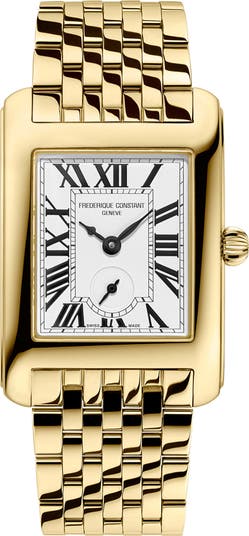 Elegantly evocative of the art deco era, this rectangular version of the classic Carrée gleams in polished goldtone-plated stainless steel framing a bright-white dial marked with Roman numerals. A signature detail—the seconds subdial—further refines the look and enhances the readability of this Swiss-made timepiece.
