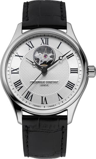 Clous de Paris guilloche detail highlights the dial of this Swiss automatic watch, giving it an iconic look that's stealthily updated by an exhibition caseback. The open 'heartbeat' at the twelve o'clock hour showcases the inner workings of the movement, while a topstitched leather strap completes the look of this refined timepiece.