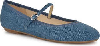 An adjustable mary jane strap adds a retro aesthetic to a versatile ballet flat fashioned with a denim upper for trend-savvy appeal.