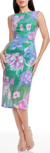 A stunning floral print furthers the garden-party vibe of this sheath cocktail dress adorned by stripes of light-reflecting sequins.
