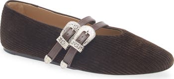 Handcrafted from smooth Italian leather and fine-wale corduroy, this cushioned flat combines codes from traditional Venetian gondolier slippers, ballerina shoes and riding boots, whose legacy lives on in engraved Western buckles—marking each stylish step into fashion’s frontier.