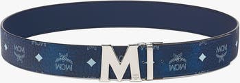 - Silver-tone cobalt metal “M” buckle