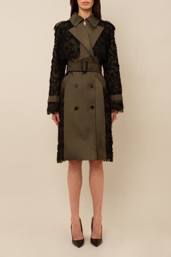 This elevated trench coat features delicate lace layers, perfect for making a statement in any setting. A belt to cinch the waist.