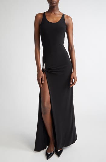 A sculptural, biomorphic claw pierces the sultry side slit of this draped jersey dress from Grace Ling's 'Neanderthal' collection—a sensual spin on primitive forms reimagined through the New York designer's futuristic lens.