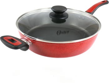 Turn up the heat with this Oster Claybon 3.8 Qt Nonstick Saute Pan With Lid in Speckled Red. Cook up anything your heart desires with confidence that it will cook evenly and not stick to the pan thanks to the aluminum construction and nonstick interior. The bakelite handle will ensure safe cooking since it will stay cool no matter how hot the pan is. Saute some veggies or even make some fried rice with this fantastic pan.
