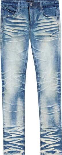 Make a bold statement with these heavily whiskered skinny jeans featuring pintucked seams at the back legs and a stacked effect at the hems.