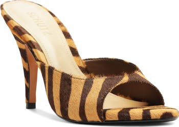 A vivid tiger print brings fierce edge to this genuine calf-hair slide sandal balanced on a sturdy heel for a chic, confident look.