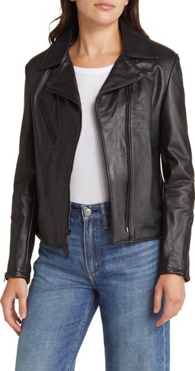 Tonal hardware details and lightweight leather construction lend true biker vibes to a sleek moto jacket made with comfortable stretch.