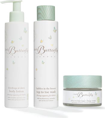 Little Butterfly London – Organic Baby Care Trio A beautifully curated trio to gently nurture delicate baby skin from head to toe. Certified organic by Ecocert Cosmos and dermatologically tested, this award-winning set provides the perfect daily ritual to cleanse, hydrate, and protect—even for the most sensitive skin.