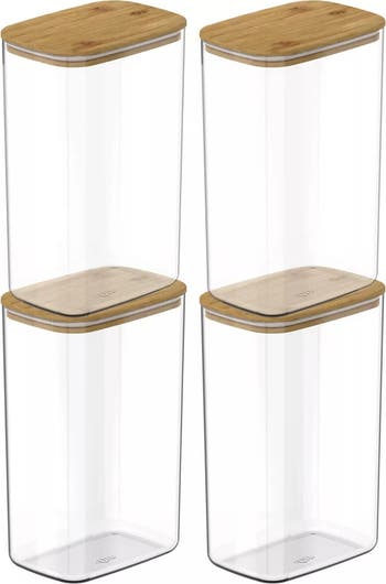 Bring clarity, style, and space efficiency to kitchen organization with this airtight food storage container set, including 4 jars with 4 wood lids for a total of 8 pieces. Each container holds 9.7 cups, making them perfect for storing pantry staples such as pasta, grains, coffee, flour, snacks, or baking ingredients. Crafted from BPA free clear polystyrene, the slim rectangular shape fits seamlessly into deep drawers or narrow shelves, maximizing storage space. Each jar features a wood lid with a silicone ring that creates a secure airtight seal, keeping contents fresh and protected from moisture. Lightweight yet durable, these stackable containers offer everyday practicality while adding a clean minimalist aesthetic to your kitchen. Whether reorganizing your pantry or optimizing tight storage areas, this set blends sleek design with reliable performance. Hand wash only. Not microwave, freezer, or dishwasher safe.