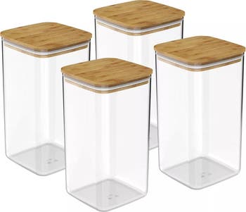 Upgrade kitchen organization with this airtight food storage container set, including 4 jars with 4 wood lids for a total of 8 pieces. Each container holds 14.8 cups, making them ideal for storing bulk ingredients such as flour, oats, pasta, cereal, or baking essentials. Crafted from clear BPA free plastic, the containers provide a safe and visible way to keep your pantry tidy and well organized. Each jar features a wood lid with a secure silicone ring that creates an airtight seal, helping maintain freshness and protect contents from moisture and air. Their sleek stackable square design makes them easy to arrange in kitchen cabinets, pantry shelves, or deep drawers. Whether streamlining storage or elevating kitchen organization, this set delivers clean modern style with practical everyday performance. Note: Labels not included. Hand wash only.