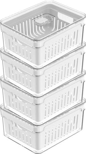 Transform refrigerator storage with this 4 Pack organizer set, designed to create a cleaner and more efficient kitchen space. This set includes four 2.3 Quart BPA free clear storage containers, each measuring 3.74 inches high by 5.9 inches wide by 7.87 inches deep. Every bin features a removable drain basket that separates excess moisture to help keep produce fresher for longer. Crafted from durable food safe plastic, these stackable containers are ideal for storing fruits, leafy greens, salad fixings, or prepped ingredients. The transparent design provides instant visibility of contents, streamlining meal prep and reducing waste. Compact and ergonomic, they include side grips for easy handling and a low profile shape that maximizes fridge space without adding clutter. Whether used for meal prep, grocery restocking, or everyday organization, this set combines clarity, convenience, and freshness for a modern kitchen routine.