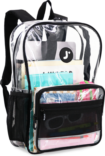 J World Clear Transparent Backpack is a perfect bag for school, sports games, concerts, parties, and festivals. The clear backpack is made of heavy duty TPU which is much durable than PVC fabrics. High quality stitching and reinforced straps are durable for daily use. Our water resistant transparent bag can protect your books, calculator and smartphone. Laptop sleeve in the main compartment, extra pockets and side pockets will keep your belongings organized. S-shaped ergonomic design see through bag will make you comfortable all day. The reinforced padded adjustable straps can be adjusted to suit your body and offer you extra comfort and stability.