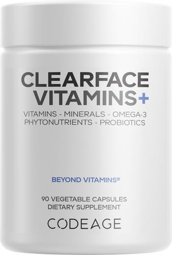 Codeage Clearface offers an all-in-one, vegan & whole-food supplement with vitamins A, C, D3, E, niacin, riboflavin, pantothenic acid, minerals, phytoceramides, probiotics, omega-3, L-lysine HCL, and an herbal blend designed to complement your skincare routine.