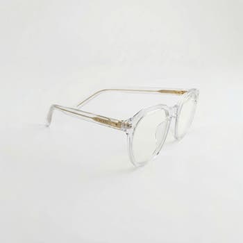 A geometric acetate eyeglass frame designed with measured proportions and a balanced 46mm lens width. Finished in Transparent and Rich Yellow Gold with a full-rim construction.