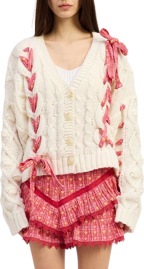 Contrasting ribbon is delicately threaded through the chunky cabled stitches that bring cozy dimension to this relaxed-fit cardi.
