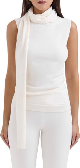 Cut from a finge-gauge knit of cotton enriched with a hint of cashmere, this gracefully draped sleeveless top is finished with a slouchy neckline that transforms into a scarf detail that trails enticingly in your wake.