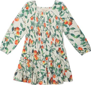 The Clementine Smocked Long-Sleeve Dress features a bright orange-and-green citrus print on a soft cream background. A smocked bodice with a square neckline offers a comfortable, flattering fit, while elastic-cuffed puff sleeves, ruffle trim and a tiered skirt with a sharkbite hem deliver twirl-worthy movement. Easy on with elastic closure. Machine wash cold, line dry, do not bleach.
